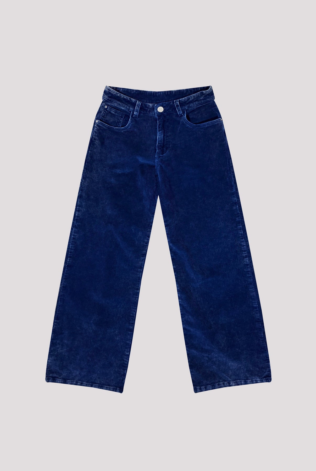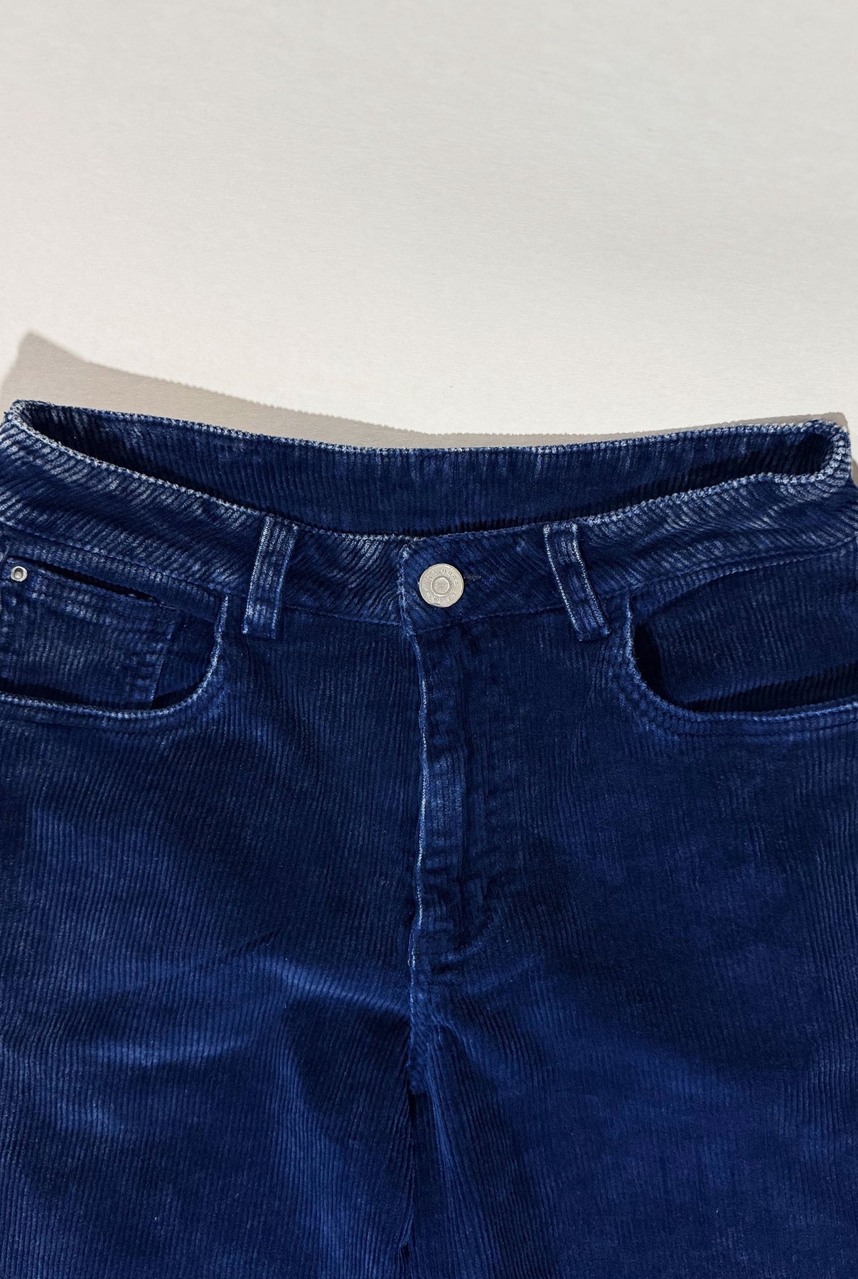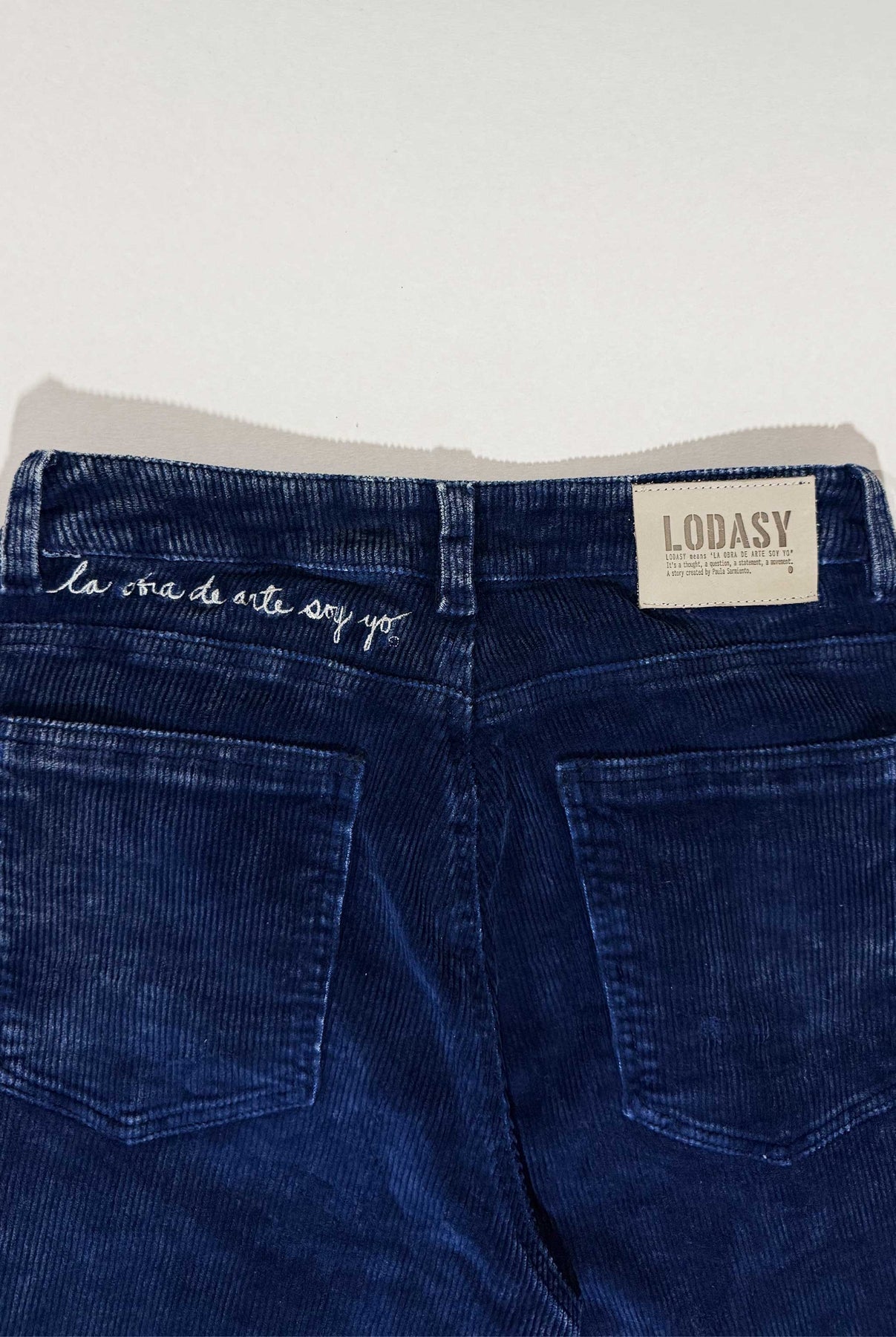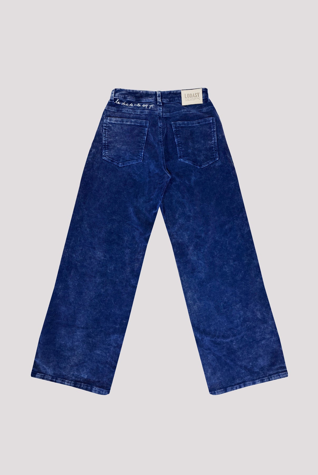 Jeans de silueta campana y tiro medio, confeccionados en corduroy acanalado, con bordado en la espalda en hilo blanco