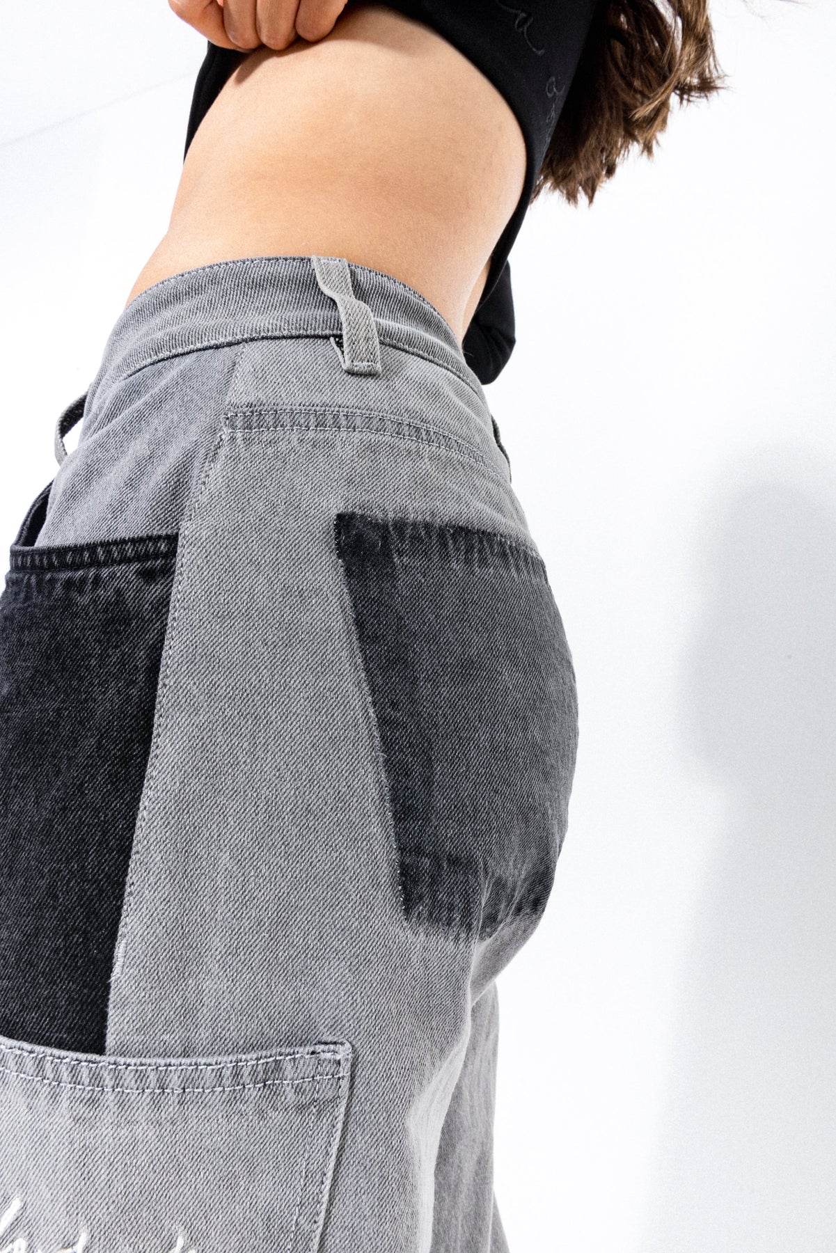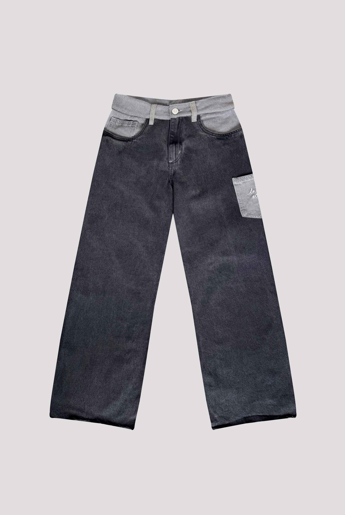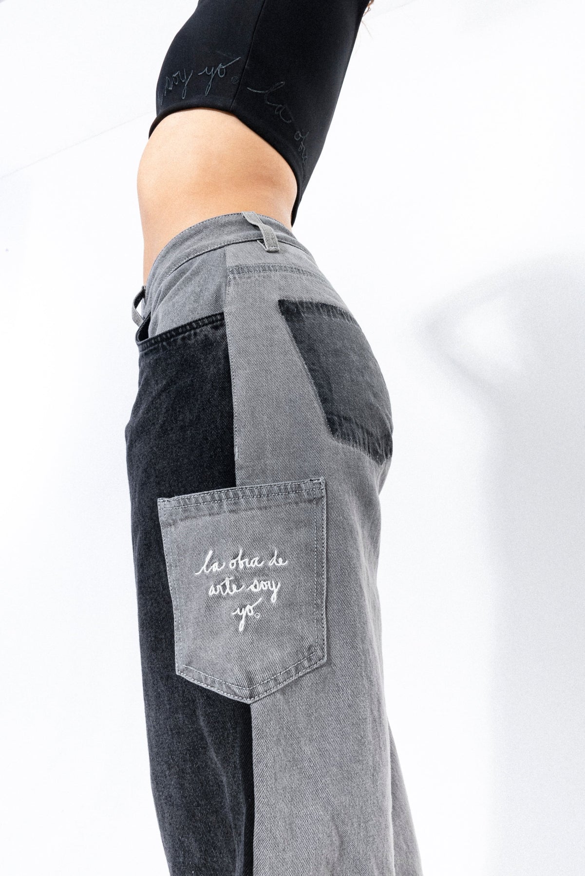 Pantalón bota campana de tiro medio, en índigo 100% algodón gris y negro, bolsillo en costado con bordado color crudo