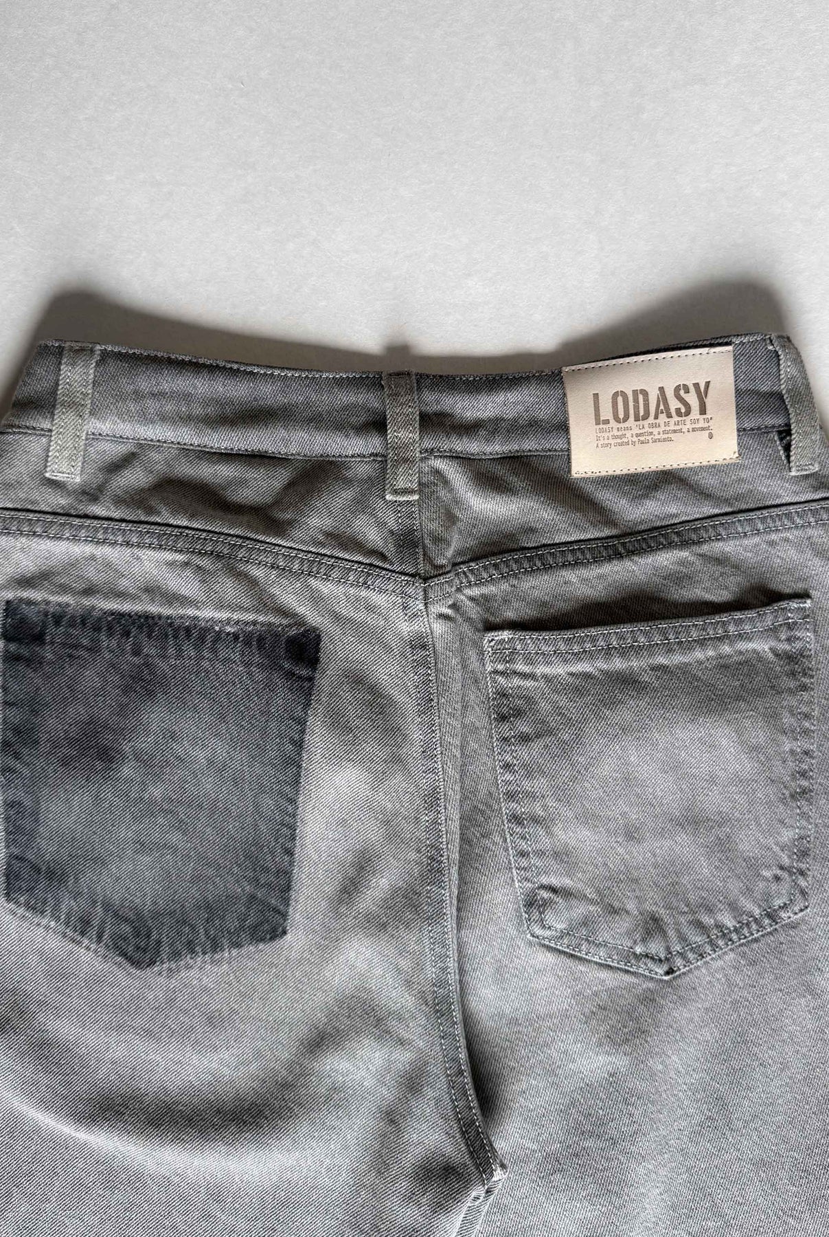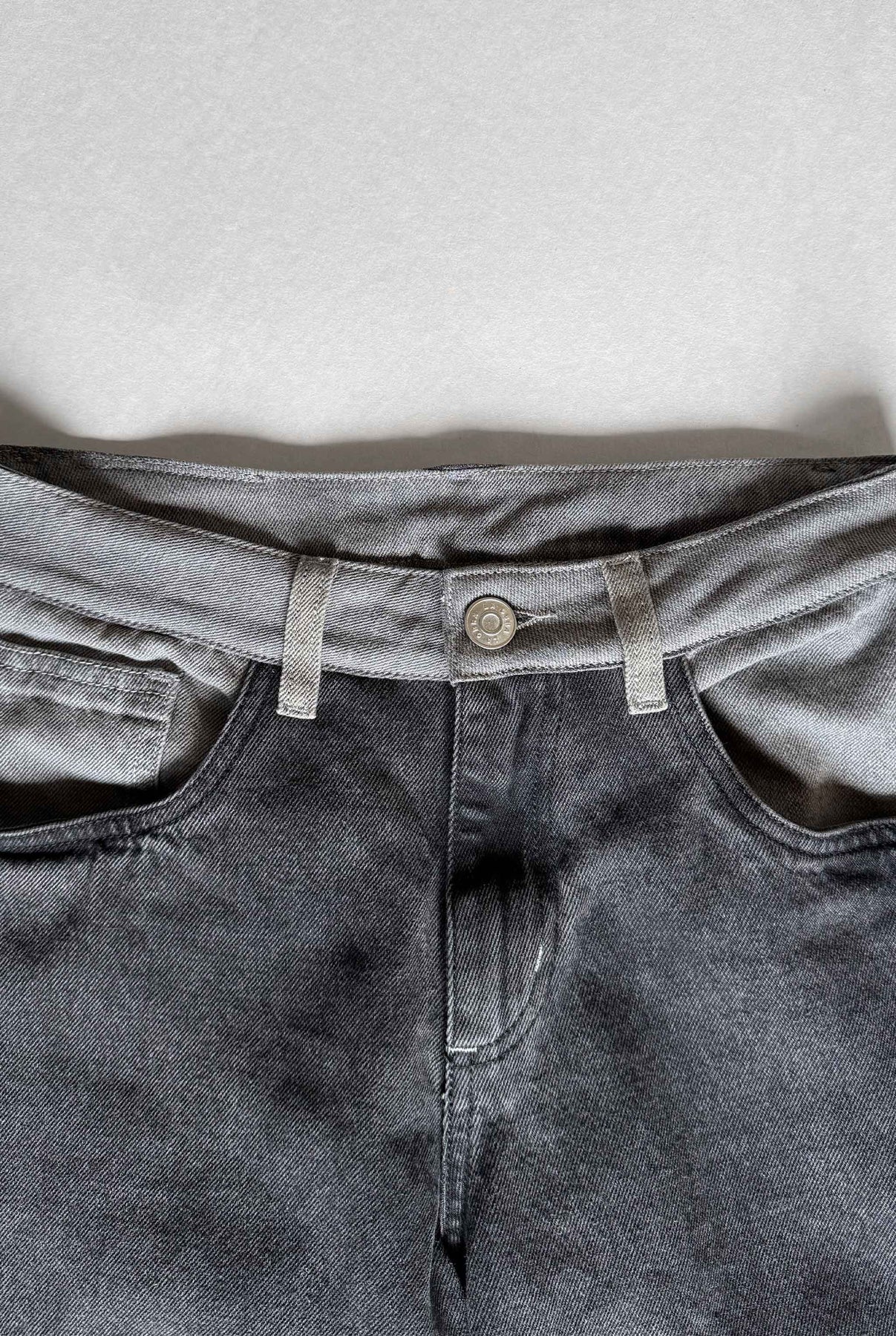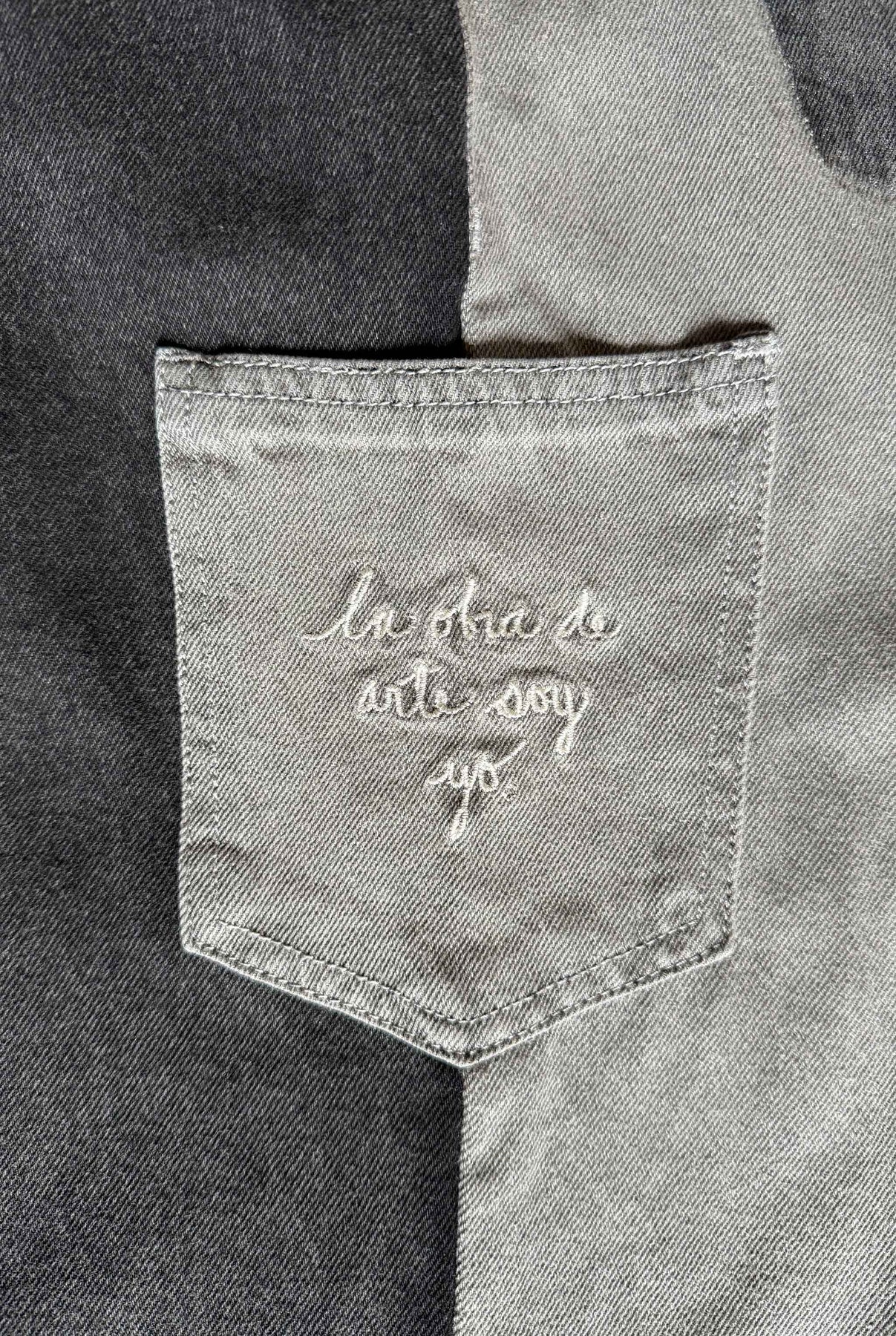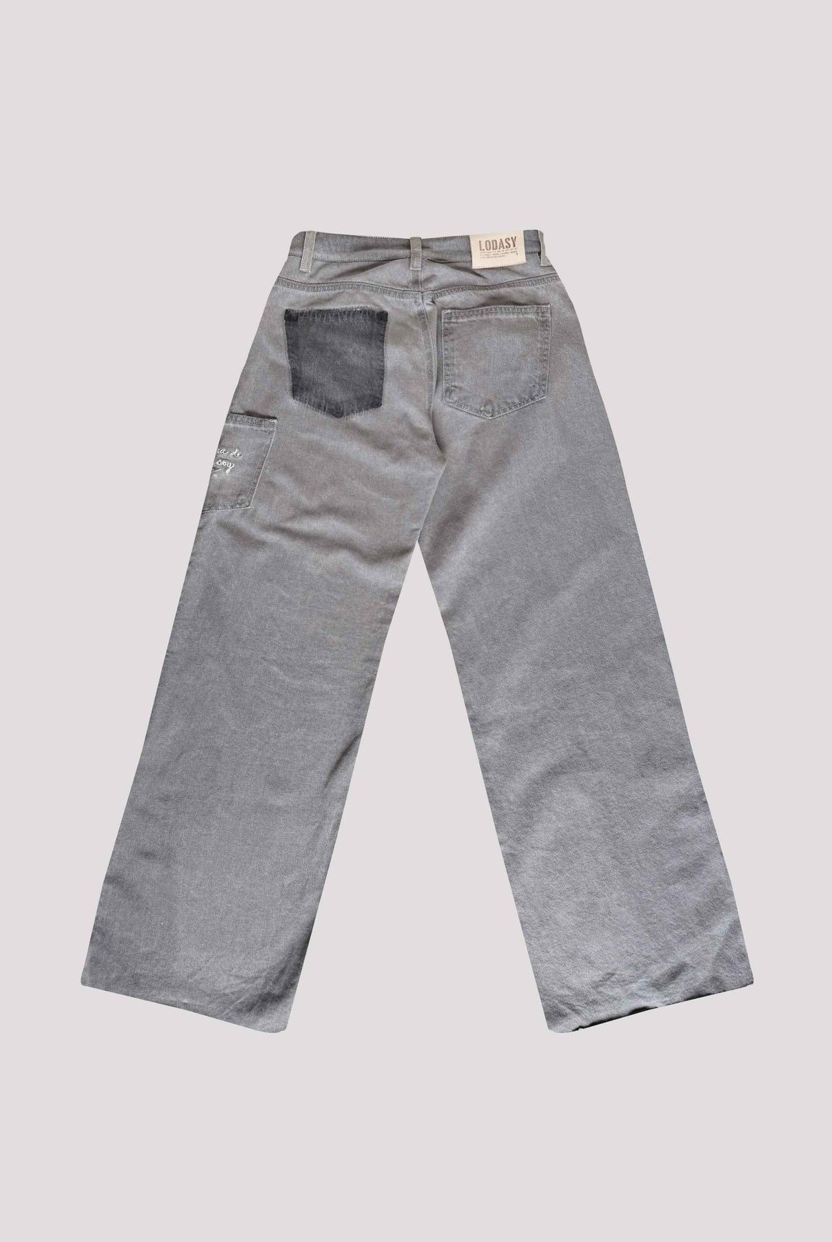 Pantalón bota campana de tiro medio, en índigo 100% algodón gris y negro, bolsillo en costado con bordado color crudo